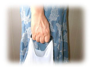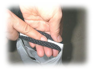 | 沢山入って重たいレジ袋を持ったときに、持手の部分が手に食い込んで痛くなるのを防ぐ補助具です。福岡特産久留米かすり(機械織です)を使用しています。 |