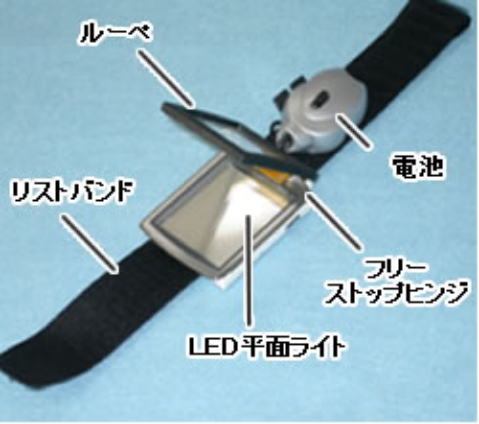 ■ 平面ライトと、ルーペをつなぐフリーストップヒンジ(折り畳み式ケータイと同様の機構)によリ、使用者の姿勢、照明の具合により、もっとも見やすい角度にルーペを設定できます。