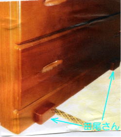 地震で家具が揺れると、家具の最下部の前面に取り付けた、左右の本装置から下に足(支え棒)が出て転倒を防止します。 |
