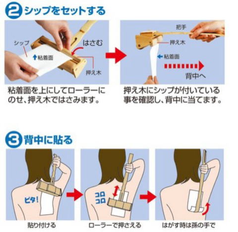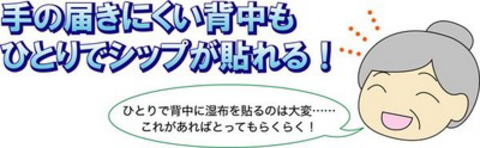 手が届かない背中の中央部に、一人で湿布が間単に貼れる湿布貼付具です。