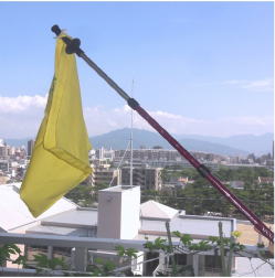 口に当てて煙を防いでいるところ ![]() 救助を求める合図として使っているところ ![]() |