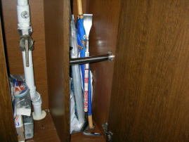 茶箪笥の倒れ防止として、ホームセンターで材料を揃え、物入れを兼ねた箱型の倒れ防止を日曜大工で取り付けました。また、昨年の地震で扉が開いて中のものが落下して散乱しましたので、扉が開かないように止め具を考案中です。    震災で一番必要なものは飲料水とトイレを流す水だそうです。常にペットボトルに飲料水をためて使用することと、使用済みのお風呂の水も捨てないで貯めておくことにしました。ペットボトルには持ちやすいようにハンドヘルパーを取付けています。