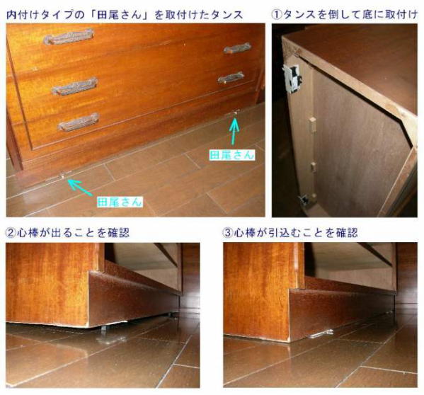 タンスの倒れ防止として、タンスの倒れ防止具「田尾さん」を取り付けました。外付けタイプはタンスの表面にねじ穴の傷が付くので、内付けタイプを取り付けました.