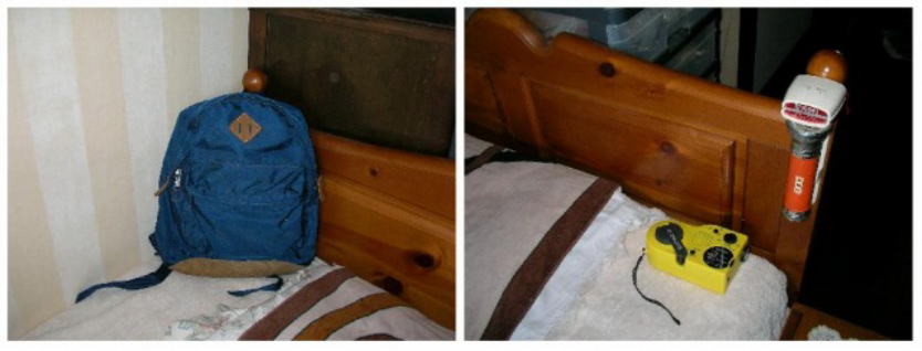 非常時持出しバッグと手回しのラジオ兼ライトと懐中電灯を枕元に置きました。